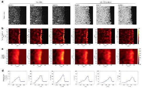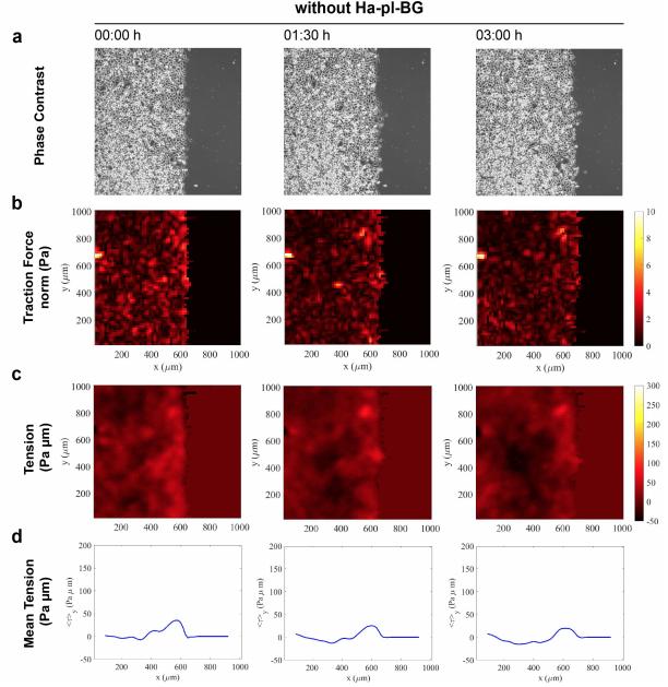 Supplementary Figure 6: In absence of the Ha-pl-BG dimerizer the internal tension of epithelial monolayers decreases over time. (a) Phase contrast images of A431 α-catenin knockout cells. (b) Traction Force Microscopy analysis of migrating cells shows that the norm traction forces are maintained as the monolayer migrates. (c) Heat maps of the mechanical tension. (d) 1D profile of the tension averaged over the direction parallel to the moving front. Internal stresses estimated by BISM on traction force data. |