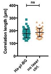 Supplementary Figure 5: Velocity correlation length is stable without photocleavage. Uncleaved control for the migration experiment described in Figure 5 b. PIV analysis of dimerizer treated cells without light-induced dissociation of AJs (no laser ctrl.) shows no significant reduction of collectivity in the observed cells as measured by the velocity correlation length. n=48 (12 time points from 4 positions) for cells before (dark green squares) and after (orange triangulars) probed cells were exposed to 405 nm, respectively. Black bars indicate mean ± s.d.; ns: not significant, p=0.2634 by unpaired t-test with Welch´s correction. |