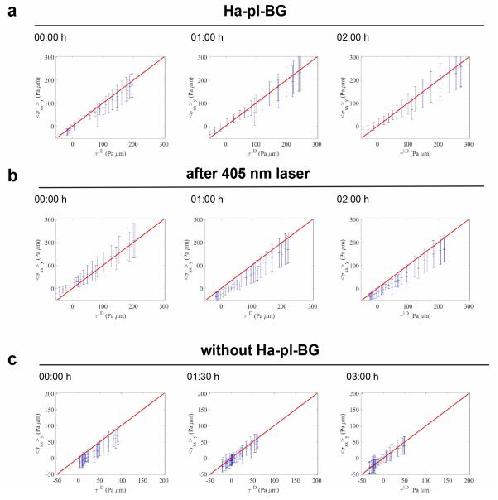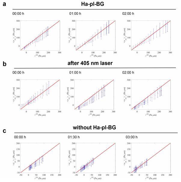 Supplementary Figure 9: Comparison with 1D tension. Plots of s!!(�,�) ' (y-averaged xcomponent of the BISM stress) vs. 1D tension t () (as in Fig. 6 and Supplementary Figure 7). Error bars are standard deviations. The red lines are the bisectors y = x for comparison. Unit: Pa µm. |
