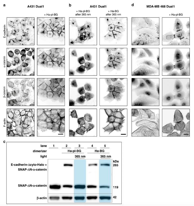 Fig. 2: Establishing a functional link between E-cadherin and α-catenin with optochemical dimerizers. a, b) Immunofluorescence images of A431 α-catenin KO cells coexpressing E-cadherin-Îcyto-GFP-Halo and SNAP-mCherry-ÎN-α-catenin. Without dimerizer E-cadherin shows diffuse membrane localization, whereas α-catenin and β-catenin are cytosolic. Dimerizer induced E-cadherin-α-catenin complex formation indirectly recruits also β-catenin and causes rearrangements of actin fibers. 365ânm light disseminates Ha-pl-BG treated cells but not Ha-BG treated cells. Scale bars 20âµm. c) Western Blot analysis of E-cadherin-α-catenin complexes. Without dimerizer (lane 1) only the 119âkDa SNAP-(mCherry)-α-catenin is detected, whereas with dimerizer (lane 2 and 4) an additional band of 265âkDa is detected, resembling the hetero-dimer E-cadherin-α-catenin complex. After 365ânm light, the heavy band disappears in Ha-pl-BG treated cells but not in Ha-BG samples (lane 3 and 5). β-actin serves as loading control. d) Application of LInDA to dissociate AJs in MDA-MB-468 epithelial cancer cells coexpressing E-cadherin-Îcyto-GFP-Halo and SNAP-mCherry-ÎN-α-catenin. Filamentous actin was labeled using phalloidin conjugated with Alexa647 dye. In absence of the dimerizer, punctate E-cadherin clusters are present at the cell membrane, whereas α-catenin and β-catenin are diffuse in the cytoplasm. Addition of Ha-pl-BG induces E-cadherin mediated AJ formation by recruiting the cytosolic α-catenin and β-catenin to the cell membrane. Scale bar 20âµm. |