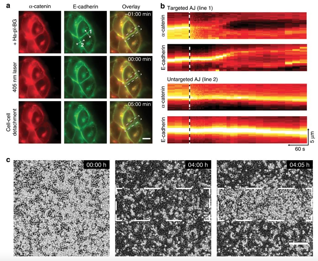Fig. 3: Multiscale targeting of AJs assembly and disassembly with high spatial precision. a) For visualization in live cell experiments, E-cadherin (shown in green) and α-catenin (shown in red) are tagged with GFP and mCherry, respectively. Targeted dissociation of Ha-pl-BG reconstituted AJs with subcellular precision before (upper row) directly after (middle) and 5âmin after 405ânm laser area scanning (white dashed rectangular in the overlay). Scale bar 10âµm. b) Kymograph analysis of E-cadherin and α-catenin intensities of targeted (line 1) and untargeted (line 2) AJs in a. The time point of laser scanning is indicated as black and white dashed lines. Scale as indicated by arrows in the lower right. c) Monolayer compaction via AJ reconstitution after addition of Ha-pl-BG leads to reintegration of the loosely attached cells in a monolayer. After 4âh, the white dashed outlined area was scanned with a 405ânm laser. Note that only cells in the targeted area change their morphology and push out excess cells immediately. Scale bar 200âµm. |