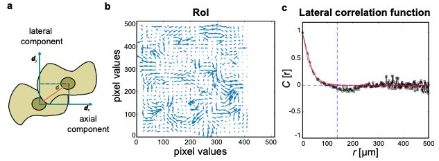 Supplementary Figure 4: PIV analysis. (a) Velocity components evaluated with the PIV analysis: dx axial component and dy lateral component of the velocity vector d. (b) Displacement vectors of moving cells between two consecutive phase contrast images are then calculated with the PIV tool. (c) We define the correlation length as the distance r at first zerocrossing of the correlation function C(r). |