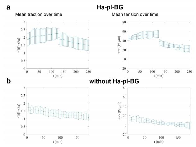 Supplementary Figure 7: Mean traction and tension values computed over time for A431 αcatenin knockout cells migrating (a) after addition of the Ha-pl-BG dimerizer and (b) in absence of the Ha-pl-BG dimerizer. Error bars indicate s.d. (number of fields analyzed over time n=5 in a and n=3 in b). |