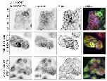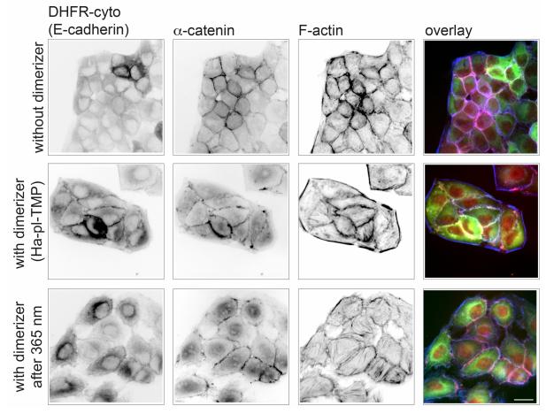 Supplementary Figure 8: Validation of the Ha-pl_TMP dimerizer to reconstitute Ecadherin. MDCK E-cadherin knockout cells were transfected to coexpress E-cadherin-DcytoHalo and DHFR-GFP-cyto(E-cadherin). Filamentous actin was labeled using phalloidin conjugated with Alexa647 dye. In absence of the dimerizer, E-cadherin is absent at cell-cell junctions, whereas a-catenin is present at the cell membrane due to association to other cadherins expressed by these cells. Addition of Ha-pl-TMP induces E-cadherin mediated AJ formation which are then disassembled following exposure to 365 nm light for 1 sec. Scale bar 20 µm. |