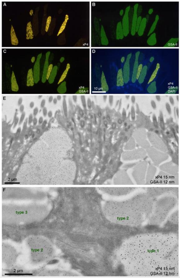 Figure 2. Labeled ultrathin methacrylate (Lowicryl K11M) sections of X. laevis esophagus. (AâD) Fluorescence microscopy of a single section labeled for xP4 with antiserum anti-xP4-1 (Cy3, yellow), mucin with GSA-II (FITC, green), and DNA of cell nuclei with DAPI (blue): xP4 (A), GSA-II (B), xP4/GSA-II double exposure (C), and xP4/GSA-II/DAPI triple exposure (D); scale bar: 10 µm. (E, F) Electron micrographs of gold labeling with the anti-xP4-1 antiserum (detected with protein A-15 nm gold particles) and mucin staining with GSA-II (12 nm gold conjugates) at two orthogonal orientations of the sectioning planes. The three types of secretory granules are marked in (F); scale bars: 2 µm.