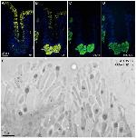 Figure 1. Labeled ultrathin methacrylate (Lowicryl K11M) sections of X. laevis stomachfundus. Fluorescence microscopy of sequential serial sections labeled for: (A) xP1 with antiserum anti-xP1-1 (Cy3, yellow); (B) xP4 with antiserum anti-xP4-1 (Cy3, yellow); (C) mucin with GSA-II (FITC, green); (D) mucin with antiserum HIK1083 (FITC, green). DNA of the cell nuclei was stained with DAPI (blue). Scale bar: 20 µm. (E) Electron micrograph of gold labeling with the anti-xP1-1 antiserum (detected with protein A-15 nm gold particles) and mucin staining with GSA-II (12 nm gold conjugates); scale bar: 2 µm.