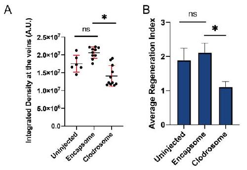 Fig S1. Clodrosome injection decreases myeloid lineage and inhibits regeneration. (A) Myeloid depletion efficiency following Encapsome or Clodrosome injections was assessed by quantifying the amount of Slurp1l expressing cell in the tail vein regions in regeneration competent tadpoles 2 days after the last liposome injection. Student`s t-test was used to assess statistical significance; *p<0.05. (B) Average regeneration index in Uninjected, Encapsome, and Clodrosome injected tadpoles. n = 3 biological replicates for each sample, error bars represent±s.e.m.. One-way ANOVA was used to assess statistical significance, *p<0.05. Note that this measurement was carried out on the same data as in Fig 1D. |