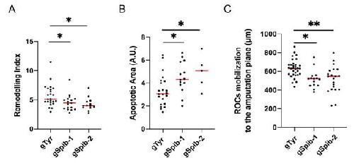 Fig S6. CRISPR/Cas9 Spib knock-out impairs relocalization of regeneration-organizing cells, apoptosis levels, and tissue remodelling (A) Quantification of ROCs relocalization at 1 day post amputation in regeneration-competent gTyr control and gSpib injected tadpoles. All samples were obtained from four independent biological batches: gTyr n= 39; gSpib-1 n= 37; gSpib-2 n=20. One-way ANOVA used to assess statistical significance, red line denotes median. *p<0.05, **p<0.001. (B) Quantification of apoptosis levels at 1 day post amputation in regeneration-competent gTyr control and gSpib injected tadpoles. All samples were obtained at least from two independent biological batches except gSpib-2 was obtained from one batch: gTyr n= 21; gSpib-1 n= 14; gSpib-2 n=5. Oneway ANOVA used to assess statistical significance, red line denotes median. *p<0.05. (C) Quantification of remodelling index for the samples at 1 day post amputation in regeneration competent gTyr control and gSpib injected tadpoles. All samples were obtained from two biological replicates: gTyr n= 24; gSpib-1 n= 17; gSpib-2 n=13. One-way ANOVA used to assess statistical significance, red line denotes median, *p<0.05. |