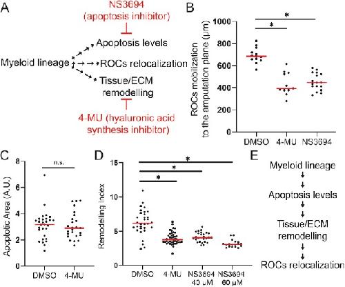 Fig 3. Sequential involvement of apoptosis, tissue remodelling and regeneration- organising- cells mobilisation following tail amputation. (A) Experimental setup for assessing the relationship between the cellular mechanisms controlled by amputation induced myeloid lineage activity. Cellular events downstream of myeloid lineage activity were assessed after drug treatments. NS3694 (apoptosis inhibitor) and 4-MU (hyaluronic acid synthesis inhibitor) were used to block apoptosis, and tissue remodelling, respectively. (B) ROCs relocalization levels at 1 dpa in DMSO control, or after 4-MU, or NS3694 treatment in regeneration-competent tadpoles. All samples were obtained from two biological replicates: DMSO n = 13; 4-MU n= 11; NS3694 n= 17. One-way ANOVA was used to assess statistical significance, red line denotes median, *p<0.001. (C) Apoptotic area at 1 dpa in DMSO or 4-MU treated regeneration-competent tadpoles. All samples were obtained from four biological replicates: DMSO n = 29; 4-MU n= 25. Student`s t-test was used to assess statistical significance, red line denotes median, *p<0.001. (D) Quantification of remodelling index at 1 dpa in, DMSO, 4-MU or NS3694 treatment in regeneration-competent tadpoles. All samples were obtained from at least 3 biological replicates: DMSO n = 32; 4-MU n: 43, NS3694 40 µM n= 26; NS3694 60 µM n= 18. One-way ANOVA was used to assess statistical significance, red line denotes median, *p<0.001. (E) Epistasis experiments suggest the myeloid lineage controls apoptosis levels which influences tissue/ECM remodelling through HA deposition and finally, ROCs relocalization. |