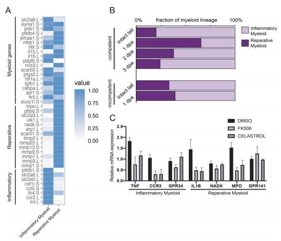 Fig. 4. A post-amputation shift from inflammatory to reparative myeloid activity characterizes regeneration-competent tadpoles. (A) Heat map showing known myeloid, reparative and inflammatory gene expression levels in the Xenopus tail cell atlas myeloid cell clusters. Values for each gene were normalized to that of the highest expressing cluster. Data were re-analysed from Aztekin et al. (2019). (B) Relative abundance of inflammatory and reparative myeloid lineage cells post-amputation in regeneration-competent and -incompetent tadpoles. Data were re-analysed from Aztekin et al. (2019). (C) Myeloid cell cluster 1 and 2 gene expressions were tested 1â day after treatment of regeneration-incompetent tadpoles with the immune-suppressing drugs FK506 or Celastrol. n>3 biological replicates for each gene expression quantification; error bars represent s.e.m. |