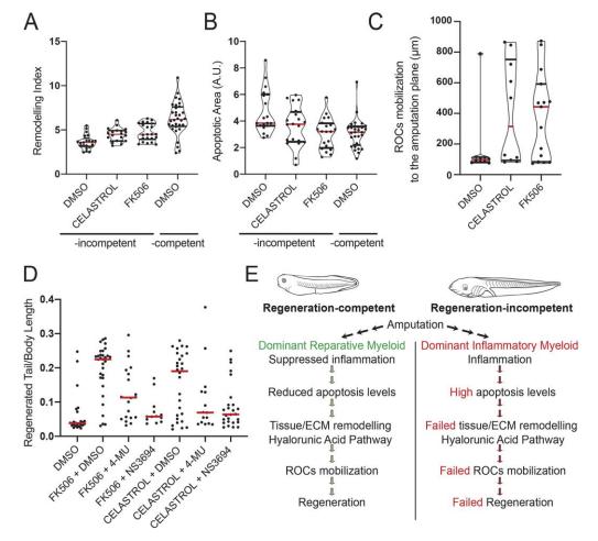 Fig. 5. Suppression of inflammation enables the emergence of a regeneration-permissive environment in regeneration-incompetent tadpoles. (A) Remodelling index at 1â dpa in FK506- or Celastrol-treated regeneration-incompetent tadpoles. All samples were obtained from three biological replicates: DMSO n=22; FK506 n=21; Celastrol n=23. Red line denotes median, and black lines denote quartiles. Note that regeneration-competent 1â dpa DMSO data from Fig. 3B were re-plotted for comparison. DMSO versus Celastrol: P<0.05 (t-test), P<0.01 (MannâWhitney U-test); DMSO versus FK506: P<0.01 (t-test), P<0.01 (MannâWhitney U-test). (B) Apoptotic area levels at 1â dpa in FK506- or Celastrol-treated regeneration-incompetent tadpoles. All samples were obtained from three biological replicates: DMSO n=19; FK506 n=20; Celastrol n=20. Red line denotes median, and black lines denote quartiles. Note that regeneration-competent 1â dpa DMSO data from Fig. 3A were re-plotted for comparison. DMSO versus Celastrol: P<0.05 (t-test), P=0.065 (MannâWhitney U-test); DMSO versus FK506: P<0.01 (t-test), P<0.01 (MannâWhitney U-test). A.U., arbitrary unit. (C) ROC relocalization levels at 2â dpa in FK506- or Celastrol-treated regeneration-incompetent tadpoles. All samples were obtained from two biological replicates: DMSO n=10; FK506 n=15; Celastrol n=10. Red line denotes median, and black lines denote quartiles. (D) Immune-suppressing drug-mediated rescue of regeneration requires apoptosis and tissue remodelling. Regeneration-incompetent tadpoles were treated with FK506 or Celastrol either alone or in combination with an inhibitor of tissue remodelling (4-MU to block the HA pathway) or an inhibitor of apoptosis (NS3694). All samples were obtained from four biological replicates: FK506+DMSO n=33; FK506+4-MU n=20; FK506+NS3694 n=13; Celastrol+DMSO n=29; Celastrol+4-MU n=15; Celastrol+NS3694 n=28. Red line denotes median, each dot represents individual tadpoles. (E) Model of myeloid lineage involvement in regeneration-competent and -incompetent tadpoles. The myeloid lineage activity controls hierarchical cellular mechanisms that create the regeneration-permissive environment required for regeneration. |