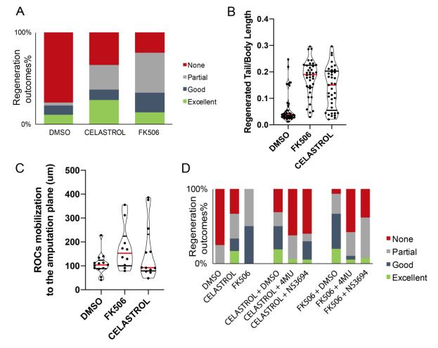 Fig S8. Immune suppressing drugs FK506 and Celastrol rescue the no-regeneration phenotype. (A) Regeneration-outcomes at 7 dpa in FK506, or Celastrol treated tadpoles in regeneration incompetent tadpoles. All samples were obtained from five biological replicates: DMSO n=40; Celastrol n=37; FK506 n=37. (B) Regeneration was assessed in individual tadpoles by comparing regenerated tail to body length ratio at 7 dpa. Note that this measurement was carried out on the same data as in Fig 8A. (C) ROCs mobilisation initiates at 1 dpa in immune suppressing drugs treated regeneration-incompetent tadpoles. Quantification of ROCs relocalization at 1 day post amputation. All samples were obtained from two biological replicates: DMSO n = 13; FK506 n= 10; Celastrol n= 12. Red bar denotes the mean. (D) Immune suppressing drugs mediated rescue of regeneration requires apoptosis and tissue remodelling. Regeneration-outcome at 7 dpa in regeneration-incompetent tadpoles treated with FK506 or Celastrol either alone or in combination with inhibitor of tissue remodelling (4-MU to block HA pathway) or inhibitor of apoptosis (NS3694). Note that this measurement was carried out on the same data as in Fig 5D. |