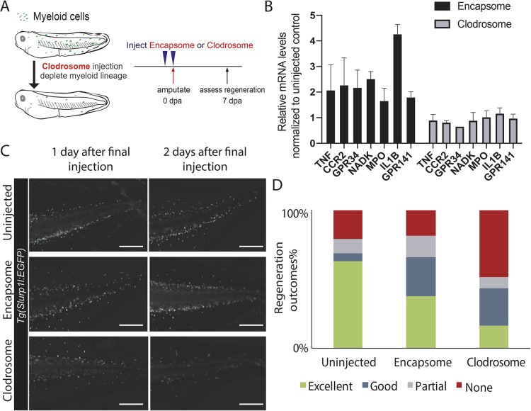 Fig. 1. Depleting the myeloid lineage impedes Xenopus tail regeneration. (A) Experimental design for assessing the effect of myeloid lineage depletion on regeneration. Regeneration-competent tadpoles were injected with either control (Encapsome), or clodronate-containing lipids (Clodrosome) before tail amputation. Regeneration efficiency was assessed at 7â days post-tail amputation (dpa). (B) Clodrosome injection decreases myeloid gene expression compared with Encapsome injection. Expression of myeloid lineage genes after Encapsome or Clodrosome injections was assessed by RT-qPCR analysis on amputated tails. All values were normalized to that of the uninjected controls. nâ¥3 biological replicates for each gene expression quantification, error bars represent s.e.m. (C) Representative images of Tg(slurp1l:EGFP) tadpoles post Encapsome or Clodrosome injection. A decrease in the slurp1l:EGFP myeloid lineage signal is particularly seen at dorsal and ventral vein regions. Scale bars: 250â µm. (D) Regeneration outcomes at 7 dpa in uninjected, Encapsome-injected or Clodrosome-injected regeneration-competent tadpoles. Samples were obtained from three biological replicates: uninjected n=30; Encapsome n=34; Clodrosome n=46. |