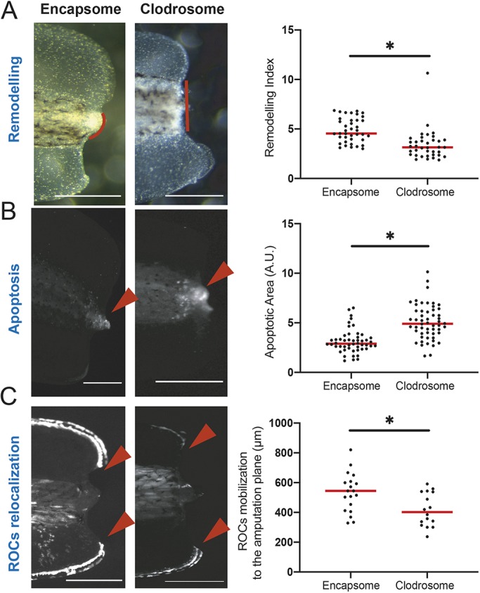 Fig. 2. The myeloid lineage is required for tissue remodelling, reduction of apoptosis levels, and relocalization of regeneration-organizing cells. (A) Left: Representative images of remodelling events occurring at 1 dpa in Encapsome- or Clodrosome-injected regeneration-competent tadpoles. Red lines indicate the posterior somitic region. Post-amputation histolysis and remodelling of tissue is impaired in Clodrosome-injected tadpoles. Scale bars: 250â µm. Right: Remodelling index quantification. All samples were obtained from at least three biological replicates: Encapsome n=39; Clodrosome n=37. Student's t-test was used to assess statistical significance; *P<0.001. (B) Left: Representative images of apoptosis occurring at 1â dpa in Encapsome- or Clodrosome-injected regeneration-competent tadpoles. The red arrowheads indicate the location of the LysoSensor signal used to report apoptosis. Scale bars: 250â µm. Right: Apoptotic area quantification. All samples were obtained from at least three biological replicates: Encapsome n=49; Clodrosome n=53. Student's t-test was used to assess statistical significance; *P<0.001. A.U., arbitrary unit. (C) Left: Representative images of ROC relocalization at 1â dpa for Encapsome- or Clodrosome-injected regeneration-competent tadpoles. The 7pbin:EGFP transgenic line was used to assess ROCs relocalization. Red arrowheads show the location of the leading ROC cells. Scale bars: 250â µm. Right: ROC relocalization quantification. All samples were obtained from at least three biological replicates: Encapsome n=19; Clodrosome n=16. Student's t-test was used to assess statistical significance; *P<0.001. In graphs, each dot represents individual tadpoles; red line denotes median. |