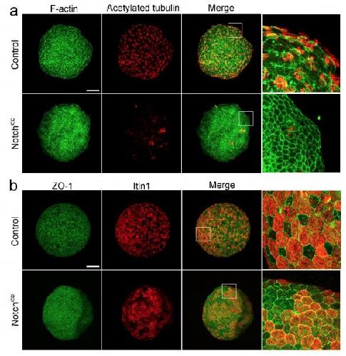 Supplementary Figure 1: Epithelialization and goblet cell specification is independent from Notch signaling. a-b, Activation of Notch signaling by over-expression of the intracellular domain of NotchICD inhibits the differentiation of multiciliated cells but does not inhibit regeneration of goblet cells in deep ectoderm aggregates (24 hpa). Inset regions of third columns (white boxes) are shown in fourth column. Scale bars are 100 μm for all image panels except insets. |