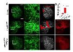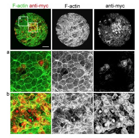 Supplementary Figure 3: ÎC-C-cadherin expressing cells are not able to transition to epithelial on the surface of deep ectoderm aggregates. F-actin and myc stained deep ectoderm aggregates at 5 hpa. Cells expressing myc-tagged ÎC-C-cadherin are detected by Anti-myc staining. Non-expressing cells epithelialize (a) while ÎC-C-cadherin expressing cells (yellow) do not (b) within same aggregate. Scale bar for whole aggregate (top row) is 100 µm. |