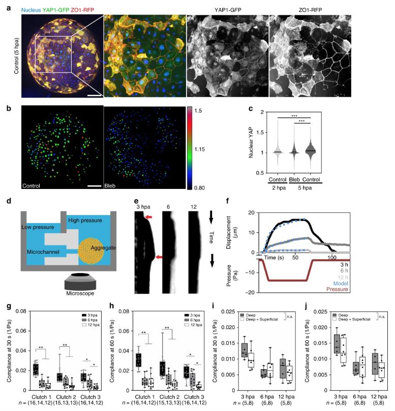 Fig. 3: YAP nuclear translocation and tissue stiffening both coincide with epithelialization. a) Maximum intensity projection of deep ectoderm aggregate expressing YAP1-GFP and ZO-1-RFP and stained for nuclei. Scale bar, 100âµm. b) Color coded nuclear YAP ratios for control and blebbistatin treated deep ectoderm aggregates at 5 hpa. Scale bar, 100âµm. c) Nuclear YAP ratios of 5 hpa aggregates (nâ=â2040 nuclei from 7 aggregates) are higher than blebbistatin-treated aggregates (3471 nuclei from 7 aggregates) and 2 hpa aggregates (2167 nuclei from 7 aggregates). Statistical analysis from one-way ANOVA followed by Tukey multiple comparison test (***Pâ<â0.001). d) Schematic of micro-aspirator used to measure tissue compliance of aggregates by adjusting pressure at the opening of the microchannel (see Methods). e) Representative kymographs of tissue displacement over the length of representative micro-aspiration experiments at 3, 6, and 12 hpa. Red arrows indicate the time suction pressure is applied and then released. f) Aspirated distances of an aggregates in (e) at 3 (black), 6 (dark gray), 12 hpa (light gray) relative to the pressure applied (red). The power-law model of creep compliance (blue dots) fit to this data. g, h) Creep compliance at 30 and 60âs indicating steady-state from micro-aspiration at 3 (black), 6 (gray) and 12 hpa (white). 12 to 16 aggregates were measured for each time point and repeated over three clutches. i, j) Creep compliance at 30 and 60âs from micro-aspiration of aggregates consisting of only deep mesenchymal cells (gray) or both deep mesenchymal and superficial epithelial cells (white) 3, 6, and 12âh post aggregation (one clutch, nâ=â5â8 aggregates each). gâj) Box plots show minimum, first quartile, median, third quartile, and maximum values. Statistical analysis by MannâWhitney U-test is shown as either not significant (n.s.) or by asterisk (*Pâ<â0.05; **Pâ<â0.01; ***Pâ<â0.001). |