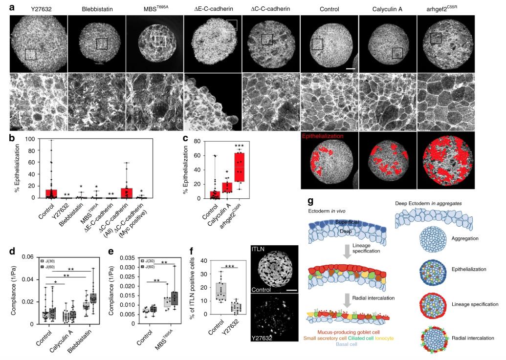 Fig. 4: Contractility and adhesion regulate surface epithelialization and goblet cell specification. a) Maximum intensity projection of F-actin stained aggregates at 5 hpa. Insets (boxes) in top row shown in lower row. Scale bar for all top row is 100âμm. b) Epithelialization (Control, nâ=â39) is reduced after lowering contractility (Y27632, nâ=â9; Blebbistatin, nâ=â10; MBST695A; nâ=â12) and altering cellâcell adhesion (ÎE-C-cadherin, nâ=â15 and ÎC-C-cadherin, nâ=â22). Analysis for mosaic ÎC-C-cadherin expression (anti-Myc positive) are shown in a separate bar. KruskalâWallis test, two-sided, (Pâ=â<0.0001 for Y27632, Pâ=â0.015 for Blebbistatin, Pâ=â0.001 for MBST695A, Pâ<â0.0001 for ÎE-C-cadherin, Pâ=â0.147 for ÎC-C-cadherin, Pâ=â0.001 for ÎC-C-cadherin (Myc positive)). c) Epithelialization is increased after increasing contractility (control, nâ=â30; Calyculin A, nâ=â12; arhgef2C55R, nâ=â10). Red filled cells indicate epithelialized cells; surface areas are quantified in the graph. Significance of each treatment from the control is calculated using a KruskalâWallis H-test, two-sided; Pâ=â0.046 for Calyculin A, Pâ<â0.0001 for arhgef2. d) Creep compliance at 30 and 60âs by micro-aspiration at 6 hpa after 4âh of small molecule inhibitor treatment. Data from four clutches were pooled with 22â25 aggregates per treatment. Statistical significance determined by MannâWhitney U-test (*Pâ<â0.05, **Pâ<â0.01). (control, nâ=â25; Calyculin A, nâ=â23; Blebbistatin, nâ=â22). e) Creep compliance for MBST695A expressing aggregates. Data from a single clutch with eight aggregates per treatment. Statistical significance determined by MannâWhitney U-test (*Pâ<â0.05, **Pâ<â0.01). f) Percentage of itln1 positive goblet cells quantified from two optical sections of 24 hpa in deep ectoderm aggregates (control, nâ=â8; Y27632, nâ=â10). Scale bar, 100âμm. Data from three clutches. Statistical analysis from unpaired t-test (two-tailed; Pâ<â0.0001). g) Schematic contrasting developmental sequence of native embryonic ectoderm with in vitro regeneration of surface goblet cells in deep ectoderm aggregates. Regenerated epithelium serves as a substrate for radial intercalation of multiple cell types including multiciliated cells, ionocytes, and small secretory cells. Regenerated epithelial cells differentiate into mucus secreting goblet cells. bâf) Box plots show minimum, first quartile, median, third quartile, and maximum values. |