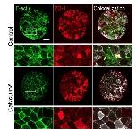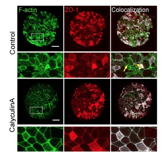 Supplementary Figure 2: F-actin and ZO-1 co-localize on the boundary of epithelial cells. Aggregates expressing ZO-1 RFP (red) and stained for F-actin (green) reveal co-localization of tight junctions and circumapical actin in epithelialized cells (white) in both control and Calyculin A treated aggregates. Inset regions from first and third rows (white boxes) are shown in second and fourth rows, respectively. Scale bars are 100 µm for all panels except insets. |