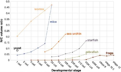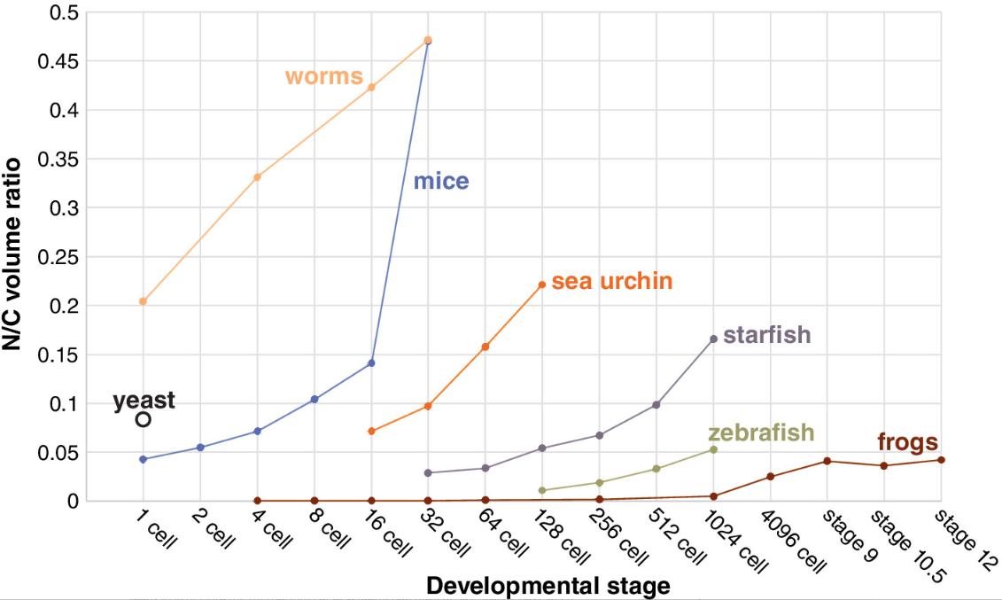 Figure 5: Nuclear‐to‐cytoplasmic (N/C) volume ratios generally increase during early development in different species. Caenorhabditis elegans worm data are from Hara and Kimura (2013). Fission yeast data are from Neumann and Nurse (2007). Mus musculus data are from Tsichlaki and FitzHarris (2016). Hemicentrotus pulcherrimus sea urchin data are from Masui and Kominami (2001). Asterina pectinifera starfish data are from Masui, Yoneda, and Kominami (2001). Danio rerio zebrafish data are from Joseph et al. (2017). Xenopus laevis frog data are from Jevtic and Levy (2015) |