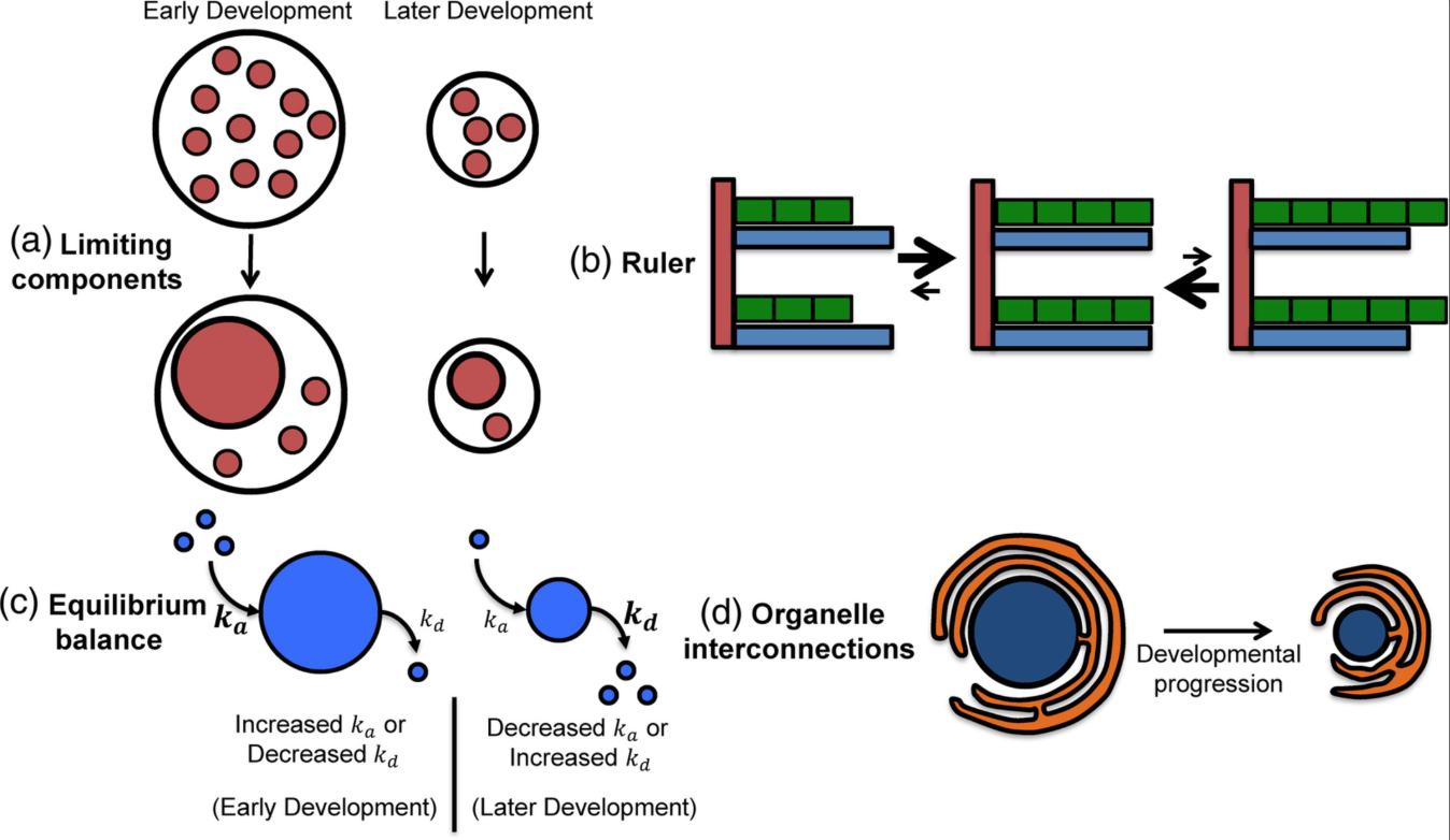 Figure 2: Models for developmental organelle size scaling. (a) Small red circles represent components that limit assembly and/or growth of the larger red organelle. Over development, limiting components are partitioned into greater numbers of smaller cells, such that the absolute amounts of limiting components per cell decrease leading to smaller organelle size. (b) Green rectangles assemble to form a linear structure whose length is dictated by the blue ruler. Developmental changes in the size of the ruler or building blocks might lead to reductions in the overall size of the structure. (c) A balance of assembly and disassembly sets steady‐state organelle size. Developmental changes in assembly and disassembly rates would lead to organelle size scaling. (d) The orange and blue organelles are connected through membranes. Developmental reductions in the size of one organelle might lead to concomitant size scaling of the interconnected organelle. Another possible scenario is that total membrane amount remains constant but membrane distribution changes such that one organelle increases in size and the other becomes smaller |