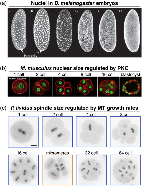 Figure 4: Developmental size regulation of intracellular structures in other model organisms. (a) Different stage Drosophila melanogaster embryos showing labeled nuclei. Numbers denote the nuclear cycle. Note that nuclei are present in a syncytium until cellularization at nuclear cycle 14. (Reprinted with permission from Kotadia et al. (2010). Copyright 2010 Wiley‐Blackwell) (b) Different stage Mus musculus embryos with DNA labeled green and cell cortex labeled red with phalloidin. (Reprinted with permission from Tsichlaki and FitzHarris (2016). Copyright 2016 Springer Nature) and made available under a Creative Commons Attribution 4.0 International License (c) Different stage Paracentrotus lividus sea urchin embryos microinjected with ATTO 565‐labeled tubulin. Scale bar, 20 μm. (Reprinted with permission from Lacroix et al. (2018). Copyright 2018 Cell Press) |