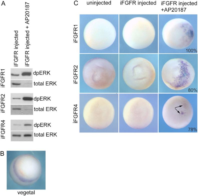 (A) Western blot showing levels of diphosphoâERK (dpERK) and total ERK in animal cap explants from embryos injected with 20 pg iFgfr1, iFgfr2 or iFgfr4 mRNA. Explants were removed at blastula stage 8 and treated with AP20187 for 2 h. (B) Whole mount immunohistochemical detection (vegetal view) of dpERK in the marginal zone of a gastrula stage 10 control embryo. (C) Whole mount immunohistochemical detection (animal view) of dpERK in animal hemisphere cells of gastrula stage 10 control embryos and embryos injected with 20pg iFgfr1, iFgfr2 or iFgfr4 mRNA (plus or minus 1 µM AP20187 treatment from blastula stage 8). Percentages of explants from a representative experiment exhibiting the presented phenotype are indicated.