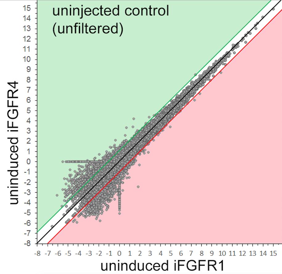 Scatterplots of log2 expression gene expression levels in neuralised animal cap explants generated from RNAâseq analysis data. Data were filtered with a cutâoff to exclude identified gene models with expression levels <30 (FKPM). Data points in the white zone, proximal to the black line (y = x) have less than twofold change in expression. Data points in the green zone have a more than twofold increase in expression relative to control (xâaxis). Data points in the red zone indicate more than twofold decrease in expression relative to control. Panel (A) compares gene expression in explants from embryos injected with 20 pg ifgfr1 or ifgfr4 mRNA in the absence of AP20187 treatment (uninduced). Panels (B) and (C) compare gene expression in explants from embryos injected with 20 pg ifgfr1 (B) or ifgfr4 mRNA (C) cultured in the absence (uninduced) or presence of 1 µM AP20187 from stage 10.5 for 3 h (induced). Panel (D) is a Venn diagram showing the overlap of gene sets up and down regulated by more than or equal to twofold following activation of iFgfr1 and iFgfr4 signalling in neuralised animal caps explants.