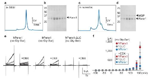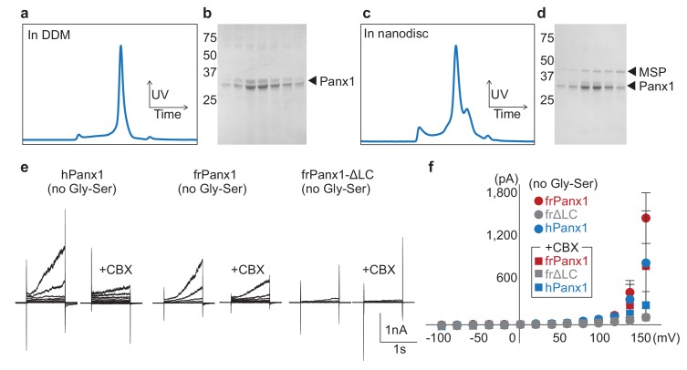 Figure 1—figure supplement 2. Characterization of frPanx1-ΔLC.(a) Size exclusion chromatogram of frPanx1-ΔLC. Concentrated protein was injected onto a Superose 6 10/300 column equilibrated with 150 mM NaCl, 10 mM Tris pH 8.0, 1 mM EDTA, 0.5 mM DDM. (b) SDS-PAGE analysis of peak fractions collected from (a). (c) Size exclusion chromatogram of frPanx1-ΔLC after reconstitution into nanodiscs. The running buffer contained 150 mM NaCl, 10 mM Tris pH 8.0, 1 mM EDTA. (d) SDS-PAGE analysis of peak fractions collected from (c). (e) Whole-cell recordings of wild-type (no Gly-Ser) hPanx1, frPanx1, and frPanx1-ΔLC. Whole-cell patches from transfected HEK 293 T cells were obtained, held at −60 mV, and stepped between −100 mV and +160 mV for 1 s. CBX (100 μM) was applied through a rapid solution exchanger. (f) Current-voltage plot of wild-type pannexin recordings shown in (e). Each circle represents the mean current at a particular voltage, with squares depicting the same current when treated with 100 μM CBX. N = 3–11. |