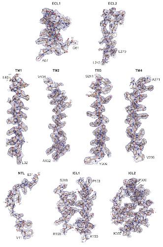 Figure 1—figure supplement 4. Representative cryo-EM density of frPanx1-ΔLC.Each domain is shown as stick representation and fit into the corresponding density contoured at σ = 3.0. |