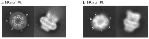 Figure 2âfigure supplement 2. 2D classes of full-length frog and human pannexin 1.(a) 2D classes of the full-length frog pannexin1 in nanodiscs showing top (left) and side (right) views. All seven protomers are labeled with numbers in the 2D class of the top view. (b) 2D classes of the full-length human pannexin one in DDM in the similar orientation to panel a. The top view shows a heptameric assembly (numbered). No symmetry was imposed in 2D classification. |