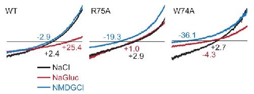 Figure 3—figure supplement 1. Representative traces of the ramp recordings.HEK293 cells were held at −60 mV and ramped between −100 mV and + 100 mV over 3 s duration. The numbers indicate the reversal potentials in mV. |