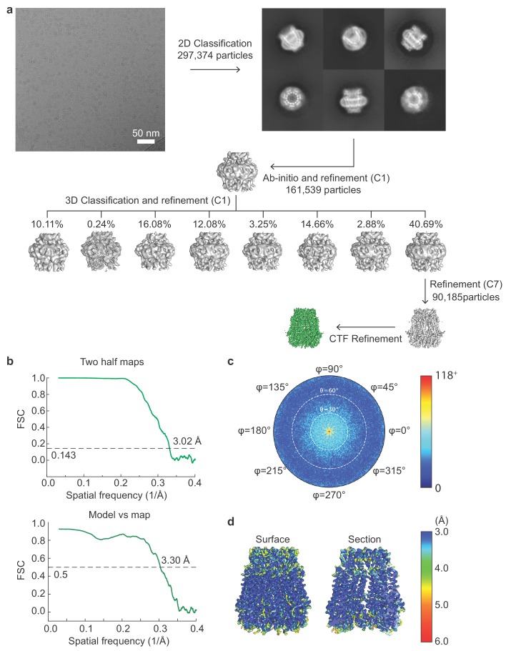 Figure 1—figure supplement 3. Cryo-EM image processing workflow for single particle analysis of frPanx1-ΔLC.(a) A representative micrograph (scale bar = 50 nm), representative 2D class averages, and the 3D classification workflow are shown. (b) The FSC plots of the two half maps (top) and the map vs model (bottom) are shown. (c) The angular distribution plot for class 3. (d) Local resolutions of class three were calculated using ResMap (Kucukelbir et al., 2014). |