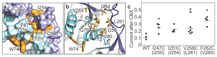 Figure 4. CBX action requires residues from both ECL1 and ECL2.(a and b) Surface (a) and cartoon (b) representations of the frPanx1 ECL1 (light blue) and ECL2 (dark blue), with potential CBX-interacting residues shown in orange. (c) Quantification of whole-cell currents from hPanx1 mutants when treated with CBX (100 μM). Mutants are numbered according to the hPanx1 sequence while the mutants in parenthesis are the corresponding residues in frPanx1. Recordings were performed by stepping to +100 mV in the absence or presence of CBX, and each point represents the normalized current amplitude during the CBX application. Bars represent the mean value from each mutant. Asterisks indicate significance of p<0.05 determined by one-way ANOVA followed by Dunnett’s test comparing WT to each mutant (F262C: p=0.0007; I247C: p=0.0471; V258C: p=0.0363). |