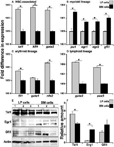 Figure 1. Analysis of lineage-specific transcription factor gene expression in X. laevis liver periphery and bone marrow cells. X. laevis liver periphery and bone marrow cells were isolated and examined by qPCR for their expression of (A) HSC-associated, (B) myeloid lineage, (C) erythroid-lineage, and (D) lymphoid-lineage transcription factor genes. All gene expressions were quantified relative to the gapdh endogenous control and normalized against the lowest observed expression. 30 μg of total cell lysate proteins from LP and BM cells was used for western blot analysis to determine the protein levels of (E) Tal1, Egr1, and Gfi1 with beta actin as a loading control. The protein levels were quantified by (F) densitometry analyses using ImageJ software. Results are means ± SEM (AâD: N = 5; E,F: N = 3) and asterisk overhead of horizontal lines denotes statistical significance, P < 0.05. |