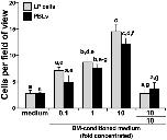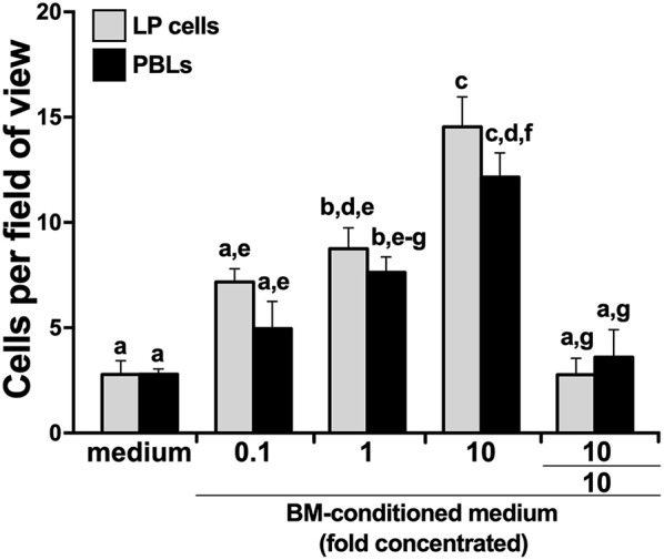 Figure 3. X. laevis bone marrow-conditioned medium chemoattracts peripheral liver and blood leukocytes. Tenfold concentrated bone marrow-conditioned medium was serially diluted and examined for its ability to chemo-attract liver periphery (LP) cells and peripheral blood leukocytes (PBLs). Chemokinesis of LP cells and PBLs was measured by adding the tenfold concentrated BM-medium to both the upper and the lower chemotaxis chambers (denoted as 10/10). All chemotaxis/chemokinesis experiments were performed using cells from five individual animals (N = 5), enumerating 10 random fields of view per chemotaxis filter per animal. Results are means ± SEM. Above-head letters denote statistical designations: experimental groups described by distinct letters are statistically different (P < 0.05), while those marked by the same letters are not. |