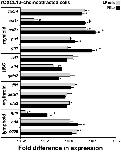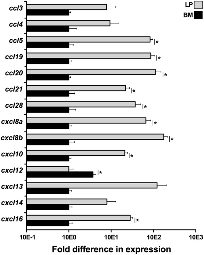Figure 4. Analysis of chemokine gene expression in X. laevis liver periphery and bone marrow. Frog liver periphery (LP) and bone marrow (BM) from five individual animals (N = 5) were examined for their expression of a panel of chemokine genes by qPCR. All gene expressions were quantified relative to the gapdh endogenous control and normalized against the lowest observed expression. Results are means ± SEM and (*) overhead of horizontal lines denote statistical significance, P < 0.05. |