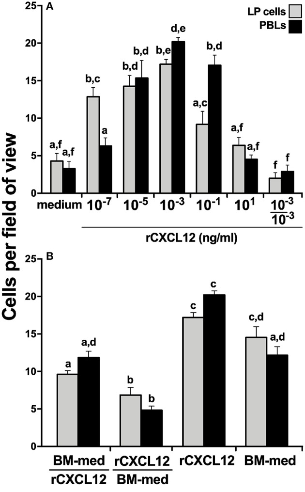 Figure 5. X. laevis rCXCL12 is chemotactic to liver periphery and peripheral blood leucocytes. A recombinant X. laevis CXCL12 (rCXCL12, 10â7-101 ng/ml) was examined for its capacity to chemoattract (A) liver periphery (LP) cells or peripheral blood leucocytes (PBLs; 104 cells/well) with chemokinesis assessed by adding 10â3 ng/ml of rCXCL12 (optimal dose) to both the upper and the lower chemotaxis chambers. (B) The relative capacities of tenfold concentrated bone marrow conditioned medium (BM-med) and rCXCL12 (10â3 ng/ml) to chemoattract LP cells and PBLs (104 cells/well) were compared through chemokinesis experiments by adding either BM-med or rCXCL12 and rCXCL12 or BM-med to the upper and lower chemotaxis chambers, respectively (denoted as BM-med/rCXCL12; rCXCL12/BM-med) and compared to BM-med or rCXCL12 in only bottom wells. All chemotaxis/chemokinesis experiments were performed using cells from 5 individual animals (N = 5), enumerating 10 random fields of view per chemotaxis filter per animal. Results are means ± SEM. Above-head letters denote statistical designations: experimental groups described by distinct letters are statistically different (P < 0.05), while those marked by the same letters are not. |