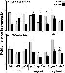 Figure 6. X. laevis rCXCL12 chemoattracts myeloid-lineage cells. Chemotaxis assay using the optimal concentration of rCXCL12 (10â3 ng/ml) was performed on liver periphery (LP) cells and peripheral blood leucocytes (PBLs; 104 LP cells or PBLs/well, cell from five individual frogs, N = 5), and the chemoattracted cells were examined for their gene expression of crcr4 (receptor for CXCL12); lineage specific markers for myeloid: csf1r (macrophage), csf3r (granulocyte), pu1, gfi1; HSC-associated: tal1, klf4, gata2; erythroid: fli1, gata1, nfe2, and lymphoid cell populations: igm (B cell); cd4 (T helper cell); and cd8 (cytotoxic T cell) by qPCR. All gene expressions was quantified relative to the gapdh endogenous control and normalized against the corresponding gene expression observed in the LP cells or PBLs (input, indicated by the dashed line) used in these chemotaxis experiments. Results are means ± SEM, (*) denotes statistical differences from the gene expression in total input LP or PBL population (indicated by the dashed line) and (*) above horizontal bars denote statistical differences between LP cells and PBLs, P < 0.05. |