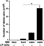 Figure 7. The X. laevis bone marrow supports the survival of liver periphery cells. The frog femurs were isolated and cut at the condyles on one side of each bone to create an opening. One femur from each animal was flushed with saline and the other with methanol to fix the stromal/supportive cells. Liver periphery (LP) cells (105 cells per femur from the same respective animals) were introduced into each of the femurs and placed in semi-solid medium with the open-end facing up. After 3 days of incubation, the viable cells in these femurs were enumerated. Results represent combined data derived from three independent such experiments, each experiment assessing tissues/cells from six individual frogs (N = 6 per experiment; N = 18). Results are means ± SEM and (*) overhead of horizontal lines denote statistical significance, P < 0.05. |