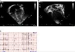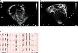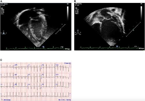 Figure 1. (A,B) Echocardiography images and (C) electrocardiogram. Still images obtained from echocardiogram of the proband at ages 2 weeks (A) and 12 months (B). Note particularly the progressive dilation and prominent rounding of the left ventricle (LV) in the later image. (C) Electrocardiogram at 19 months of age demonstrating sinus rhythm and left ventricular enlargement. |
