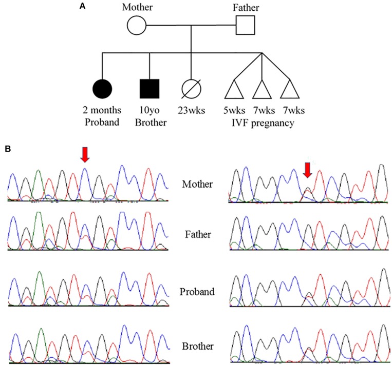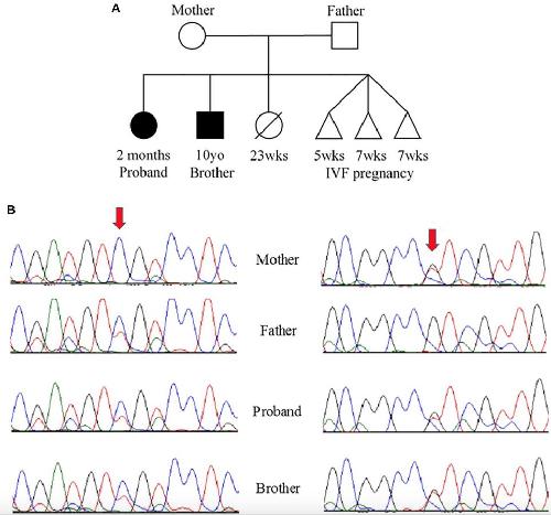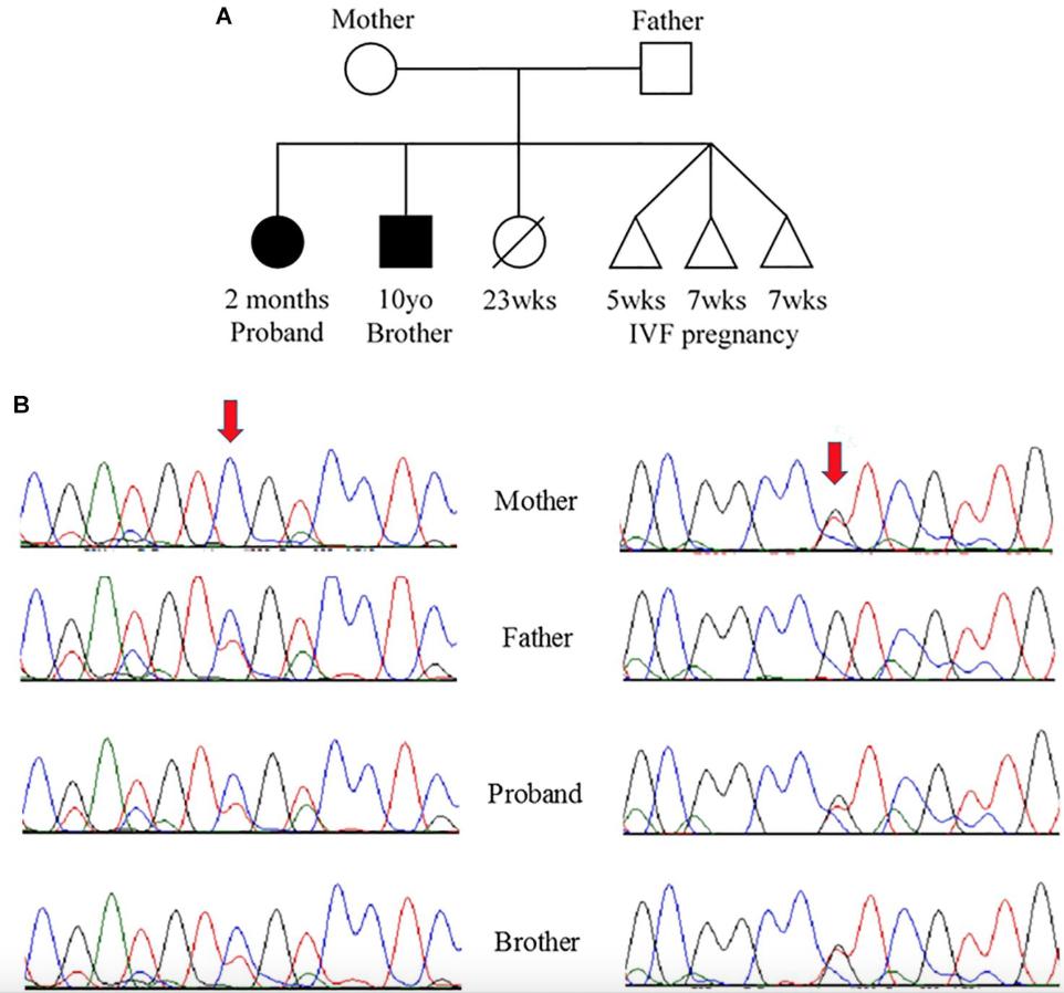 FIGURE 2. (A) Pedigree and (B) Sanger sequencing. (A) Family pedigree showing the proband and similarly affected brother (black shading). There was a prior loss of a severely premature live birth and three prior failed IVF pregnancies. (B) Sanger sequencing data from the four available family members. Red arrows indicate residue of interest. The left side shows residues around the c.394G>A change that results in D132N in one of the two alleles for TNNC1 for three of four individuals (mother is reference, other three are heterozygous for the variant). The right side shows residues around the c.435C>A change that results in D145E in one of the two alleles for TNNC1 for three of four individuals (father is reference, other three are heterozygous for the variant). |