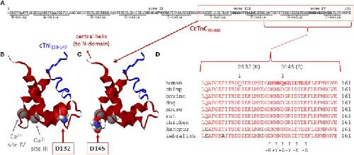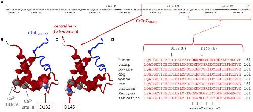 Figure 3. (AâD) Sequence and structure analyses of cTnC surrounding divalent cation-binding site IV. (A) Primary sequence of human cTnC (NP_003271.1). Divalent cation-coordinating regions (sites II, III, and IV) are highlighted in bold, and amino acids that comprise α-helical regions (N-helix and α-helices AâH) are underlined [annotated according to Li and Hwang (2015)]. Site II [EF-hand comprised of a-helices CâD and joining residues] is in the N-domain of cTnC and is the regulatory âtriggerâ site that activates contraction when Ca2+ binds during the systolic Ca2+ transient. Sites III and IV (EF-hands comprised of α-helices EâF or GâH, respectively, along with the respective residues that join each pair of α-helices) are in the C-domain and can bind Mg2+ or Ca2+. Note that all 161 amino acids of the primary sequence are intentionally shown as a single row to illustrate the relative sizes and locations of annotated regions. (B,C) Ribbon structures of the Ca2+-saturated C-domain of human cTnC in complex with a cardiac troponin I peptide (cTnI128â147), illustrating the locations of D132 and D145 (red arrows). NMR structure adapted from PDB 1OZS model 1 (Lindhout and Sykes, 2003) using MATLAB (ver. R2018b, The MathWorks, Inc.) molviewer. cTnC90â161 (dark red) and cTnI128â147 (blue) are shown as backbone ribbons, with space-filled atoms to highlight cTnC residues D132 and D145 (CPK colors). Ca2+ ions at sites III and IV are large gray spheres (gray arrows); note that, physiologically, it is likely that Mg2+ rather than Ca2+ would be bound at most sites III and IV in the sarcomeres of living cardiomyocytes. Labels in either panel (B) or (C) apply to the locations of structural elements in both panels. Note that only one affected amino acid is highlighted in each of panels (B,C), corresponding to the occurrence of only one of the two variants in each TNNC1 allele of the probandâs genome (Figure 2B). (D) Multiple alignments of residues around site IV demonstrate a remarkable degree of conservation of amino acids D132 and D145 across a wide range of species. Conserved amino acids are shown in red. Affected residues D132 and D145 are identified by underlines (human sequence) and arrows (above). D132 is within the G-helix (refer to panel A) that is part of site IV EF-hand. D145 is at the +Z location within the divalent cation-coordinating region of site IV; all 12 residues of this region are highlighted in bold in the human sequence (top sequence), as in panel (A), and the coordinating residues (+X, +Y, +Z, âY, âX, and âZ) within site IV are annotated (arrows) below the aligned sequences. |