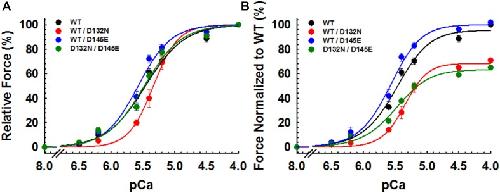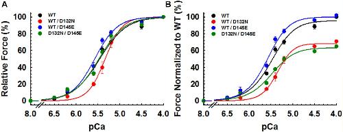 Figure 5. Ca2+ dependence of steady-state isometric tension in porcine CMPs reconstituted with exogenous cTnC WT (100% WT) or variants (50% WT/50% D132N, 50% WT/50% D145E, or 50% D132N/50% D145E). (A) Relative steady-state isometric force as a function of pCa. The force values were normalized to the maximal steady-state isometric force in the same preparation. (B) Normalized steady-state isometric force as a function of pCa. The force values were normalized to the maximal steady-state isometric force generated by WT. Data are shown as mean ± S.E. and best fit parameter estimates from non-linear least squares regression on the Hill equation are summarized in Table 2 (n = 4–8). |