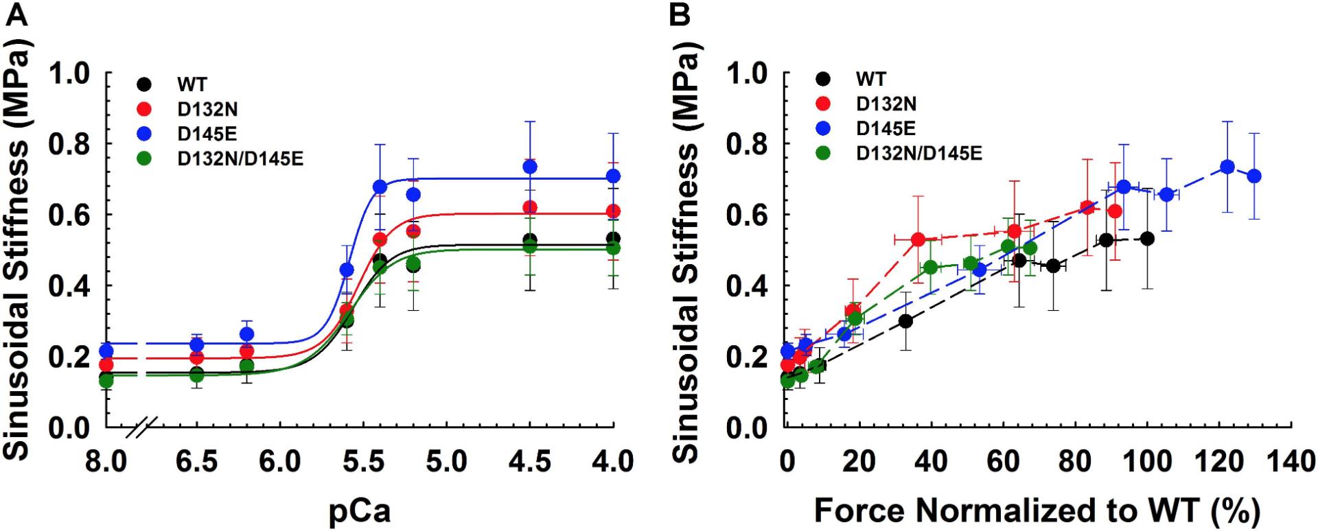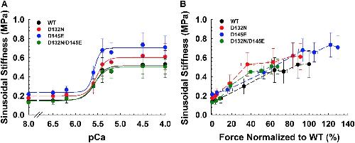 Figure 6. Sinusoidal stiffness analysis in porcine CMPs reconstituted with exogenous cTnC WT (100% WT) or variants (50% WT/50% D132N, 50% WT/50% D145E, or 50% D132N/50% D145E). (A) Ca2+ dependence of steady-state sinusoidal stiffness. (B) Normalized force vs. steady-state sinusoidal stiffness. The force values were normalized to the maximal steady-state isometric force generated by WT. (B) Dashed lines were drawn to connect the points. Data are shown as mean ± S.E. and maximum SS values are summarized in Table 3. |