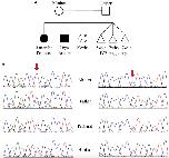 Figure 2. (A) Pedigree and (B) Sanger sequencing. (A) Family pedigree showing the proband and similarly affected brother (black shading). There was a prior loss of a severely premature live birth and three prior failed IVF pregnancies. (B) Sanger sequencing data from the four available family members. Red arrows indicate residue of interest. The left side shows residues around the c.394G>A change that results in D132N in one of the two alleles for TNNC1 for three of four individuals (mother is reference, other three are heterozygous for the variant). The right side shows residues around the c.435C>A change that results in D145E in one of the two alleles for TNNC1 for three of four individuals (father is reference, other three are heterozygous for the variant). |