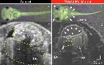 Figure 4. (A,B) Brightfield microscopy and (C,D) Optical Coherence Tomography (OCT) imaging of Control and TNNC1 F0 knockout tadpoles. As compared to control tadpoles (A), TNNC1 knockout tadpoles (B) show normal gross morphology, but significant total body edema (white arrows) secondary to severe dilated cardiomyopathy leading to congestive heart failure. Red arrows indicate plane of OCT images in (C,D). OCT images demonstrate normal size and wall thickness of cardiac chambers in control tadpole (C), with severe dilation and enlargement of the ventricle in TNNC1 knockout tadpole (D), indicated with white arrowheads. V = ventricle, LA = left atrium, RA = right atrium. |