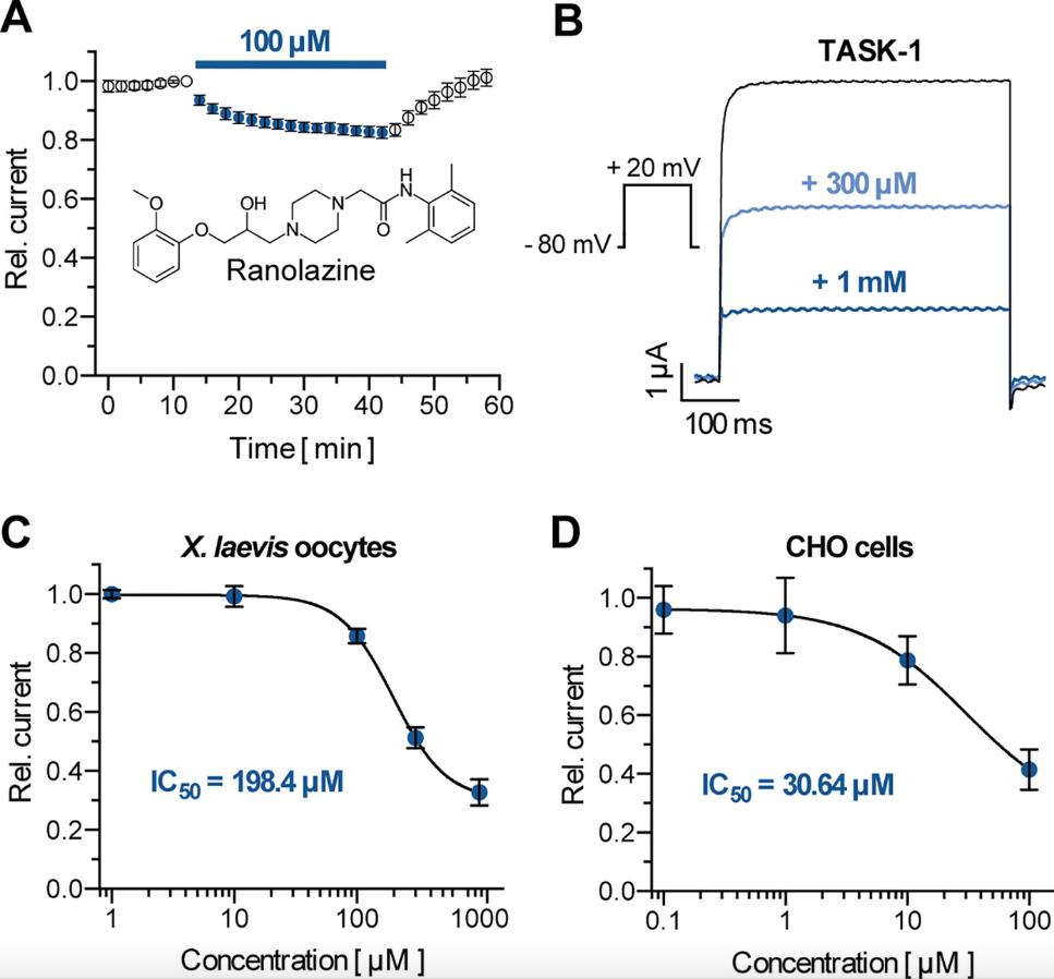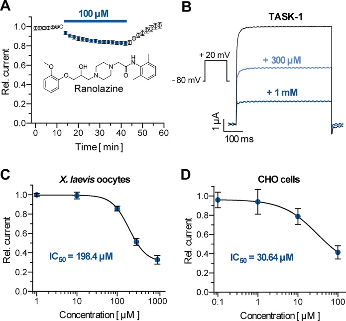 Figure 1. Effect of ranolazine on TASK-1 current. (A) Time course of TASK-1 current reduction during ranolazine application (n = 6); currents are normalized to their respective value before ranolazine application after a stabilization period with no significant amplitude changes. (B) Representative TASK-1 current recordings evoked by applying a test pulse from −80 mV to +20 mV under control conditions and after 30 min incubation with 300 µM and 1 mM ranolazine. (C) Dose–response curve of TASK-1 inhibition by ranolazine in X. laevis oocytes. Currents are normalized to their respective values under control conditions (n = 5 – 10). (D) Dose–response curve of TASK-1 inhibition by ranolazine in CHO cells. Currents are normalized to their respective values under control conditions (n = 5). Data are given as mean ± SEM. |