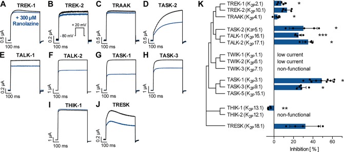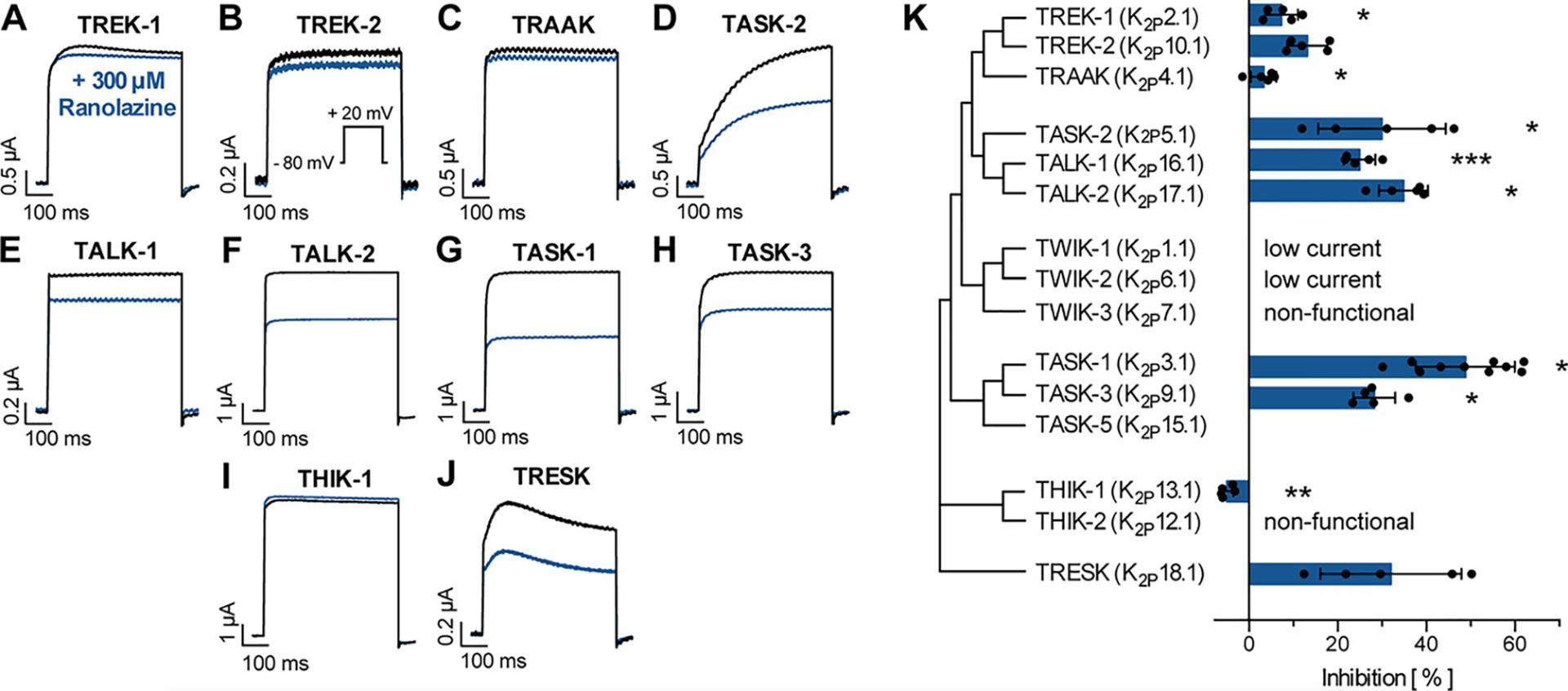 Figure 4. Effect of ranolazine on different members of the K2P channel family. (A–J) Representative current recordings evoked by a test pulse from −80 mV to +20 mV under control conditions and after 30 min incubation ranolazine. (K) Current inhibition by 300 µM ranolazine is displayed for the different K2P channel family members. Data are given as mean ± SEM. *p < 0.05, **p < 0.01, ***p < 0.001, paired t-test vs. control measurements. |