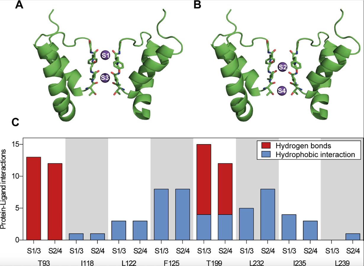 Figure 5 Summary of protein–ligand interactions of all calculated docking poses of ranolazine at the inner pore of the wild type (WT) TASK-1 model (T16cq6). (A, B) Docking calculations have been performed with potassium ions either at positions S1 and S3, or at positions S2 and S4. (C) Each calculation yielded 10 ranked docking poses, resulting in a total of 20 poses. Protein–ligand interactions have been analyzed using PLIP (Salentin et al., 2015). The amount and character of the interactions is displayed for the individual amino acid residues that interact with ranolazine. |
